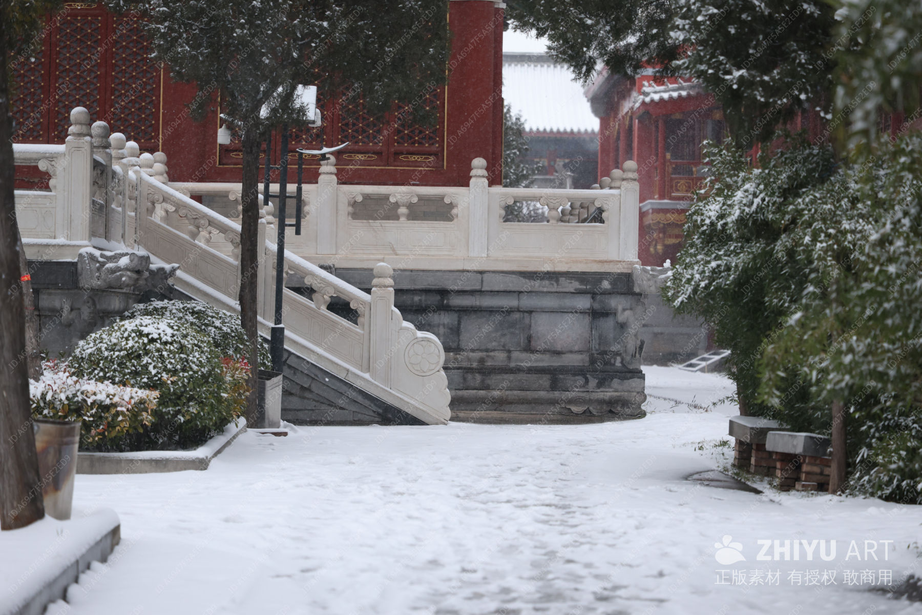 雪覆古建石雕景