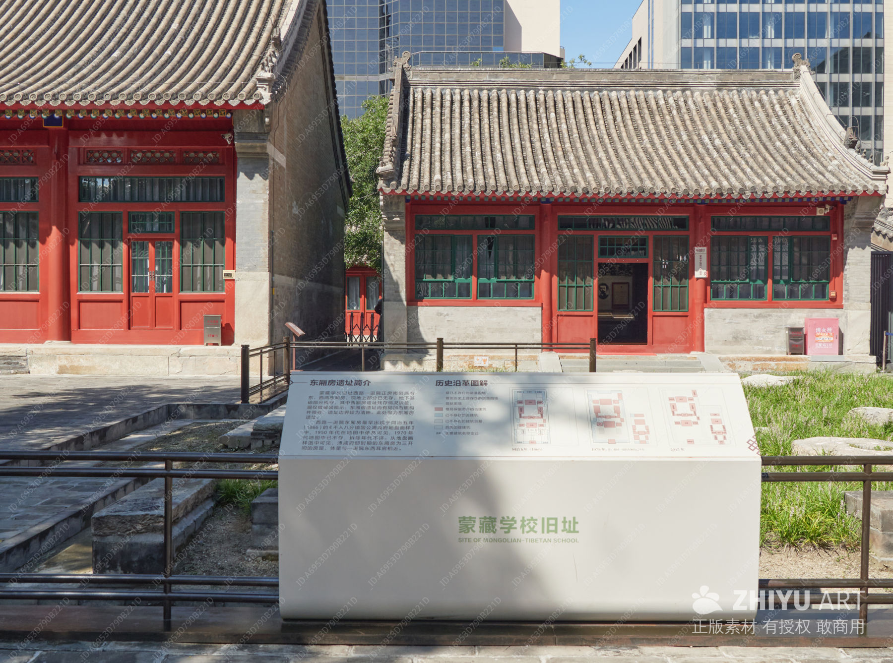 古建筑 红色门窗 灰色瓦顶 历史遗址 信息牌 现代高楼 绿植 阳光明媚 文化传承 旅游景点 建筑 寺庙 红色 地标建筑 颜色 北京市 西城区 中式 四合院 传统 灰瓦 红门 文保单位 屋顶 红墙 展示 风貌 衬景 户外 庭院 环境 构件