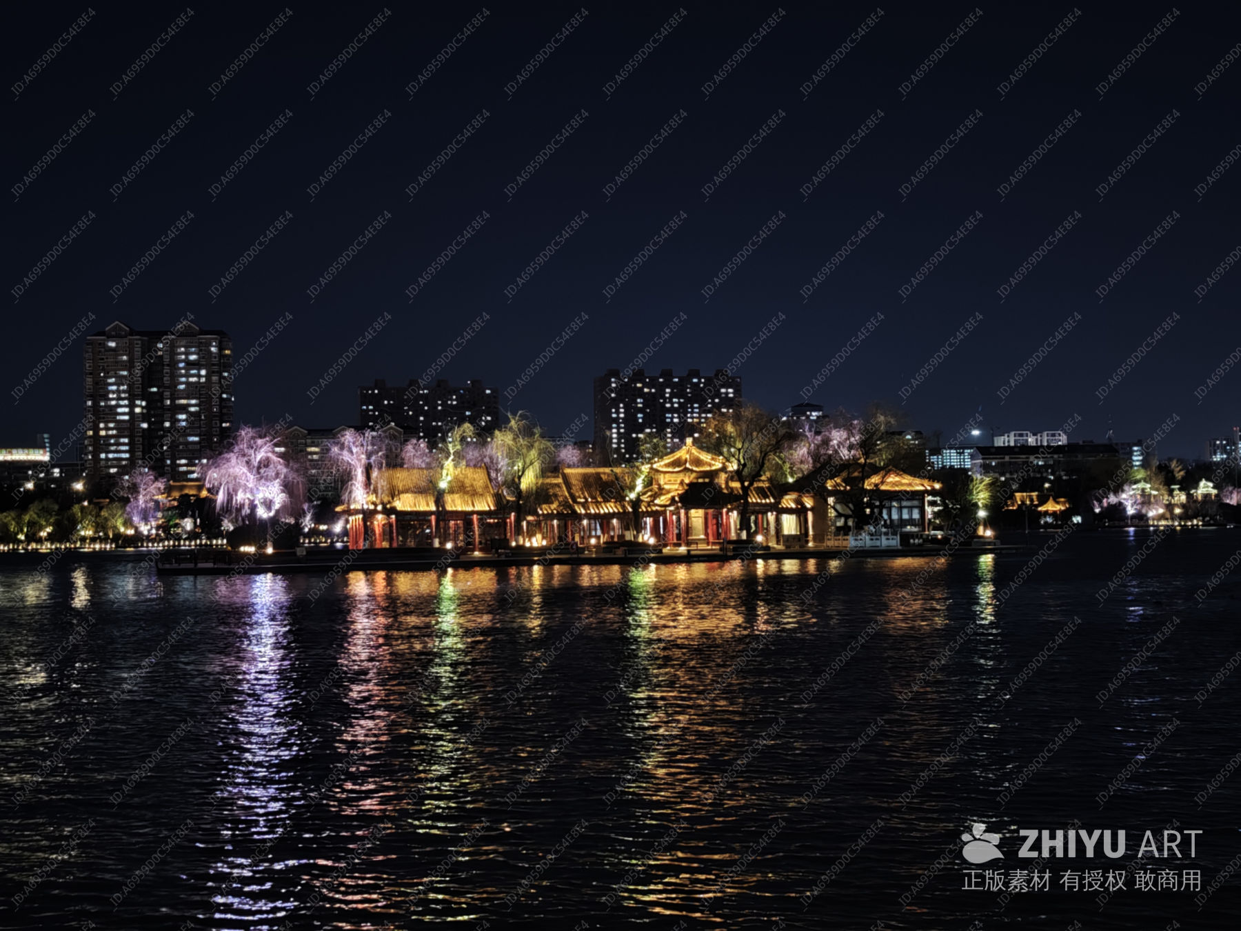夜幕下的水畔古建筑