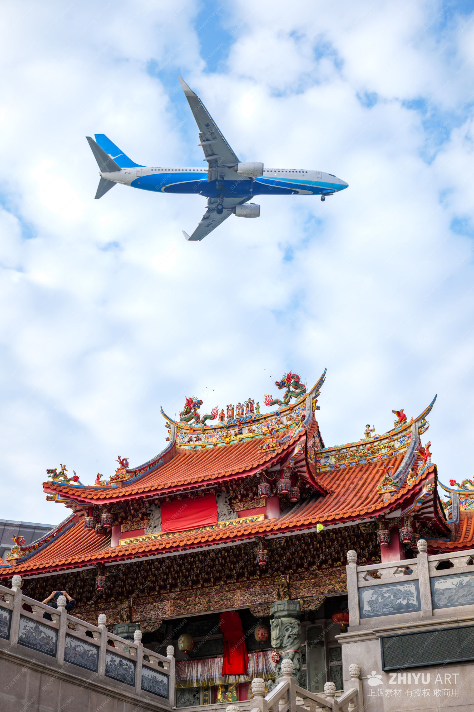 飞机飞越传统寺庙
