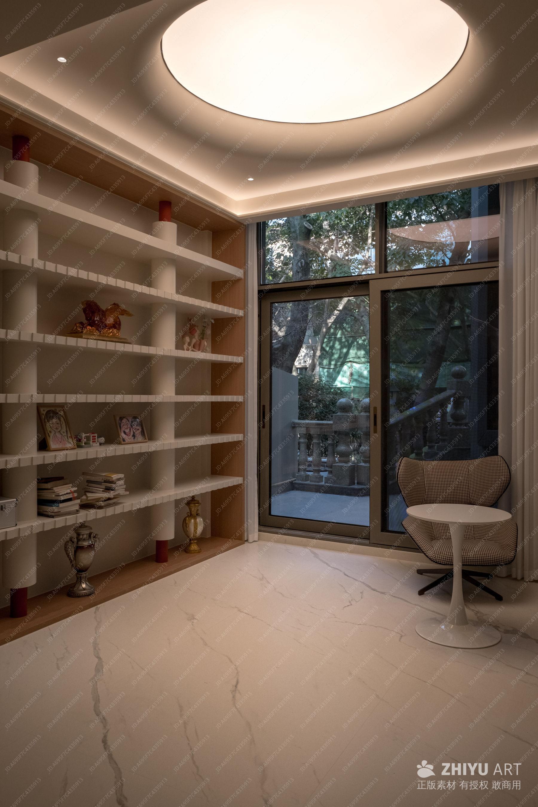 现代书房 大理石地板 落地窗 书架 简约设计 舒适氛围 自然光线 装饰品 自媒体场景 生活美学 房间 搁板 架子