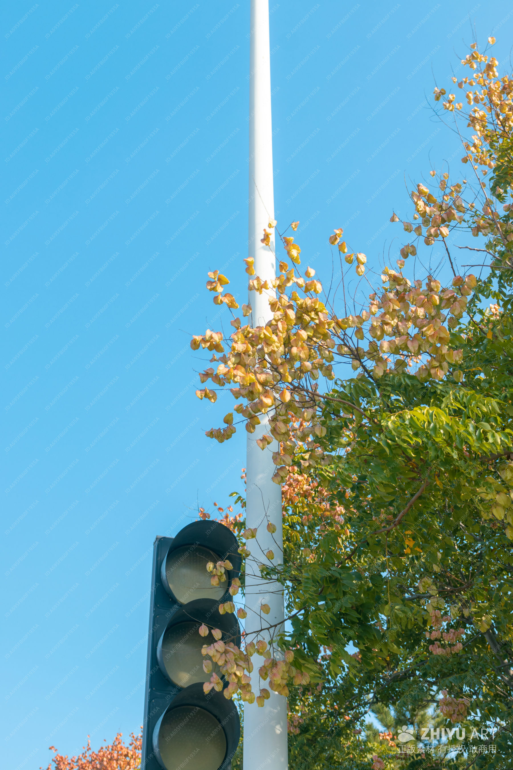 秋日街景:信号灯与黄叶树
