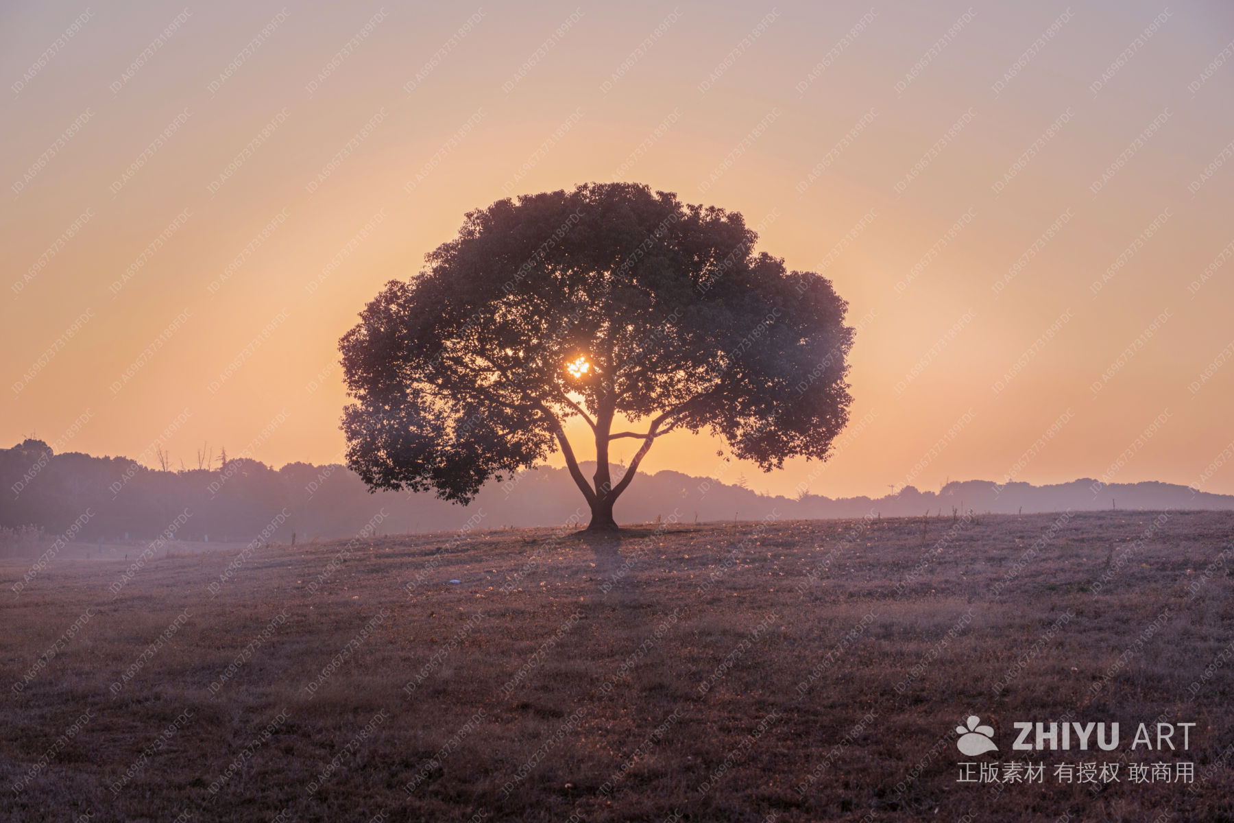 夕阳下的孤树与湖景