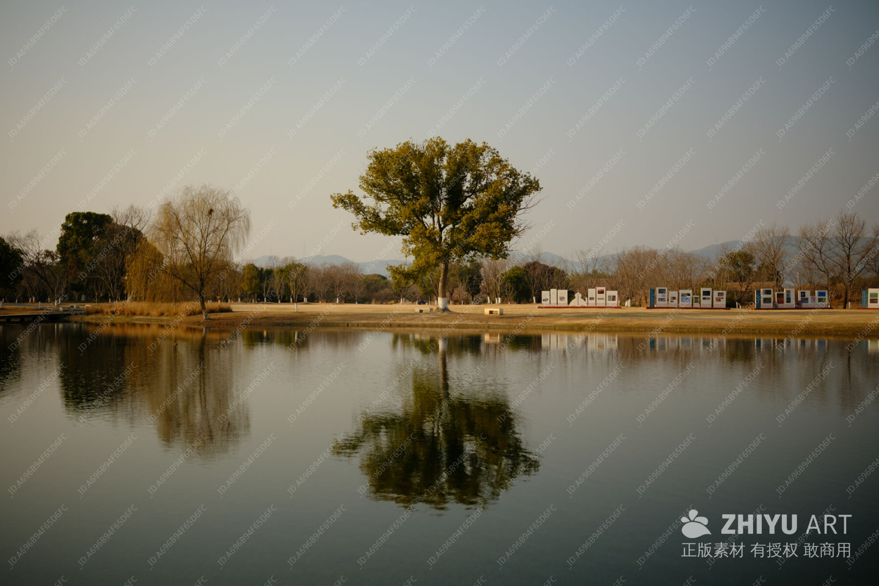 湖畔孤树映夕阳